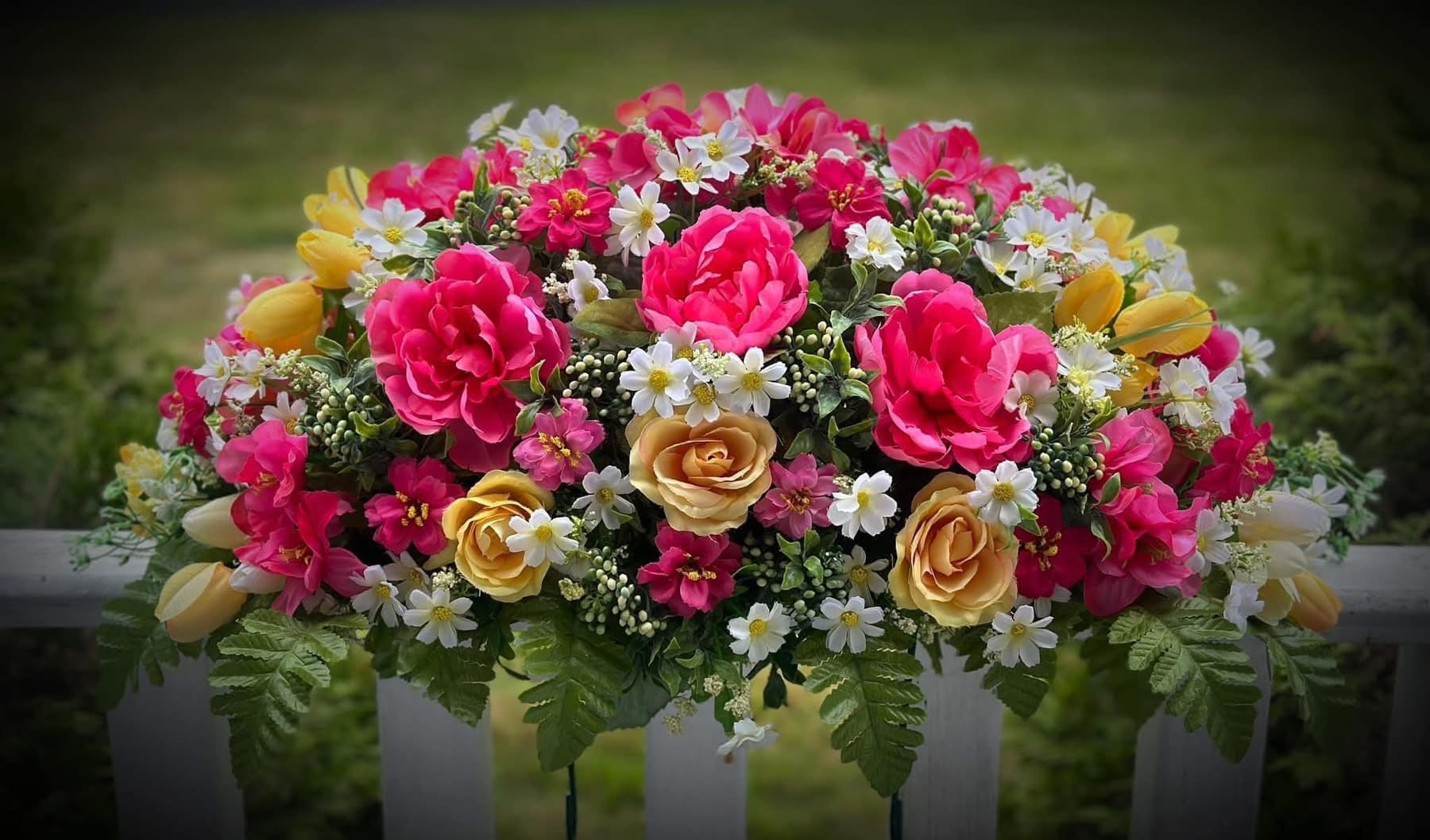 Introducing our unique grave saddles, each one handcrafted with a one-of-a-kind color blend. Customers can choose from a variety of color options and will receive a truly original product. These pictures are examples of some color combinations only. Connect with us via chat or email contact@cathysuedesigns.ca to discuss your preferences and create a personalized design before you check out.